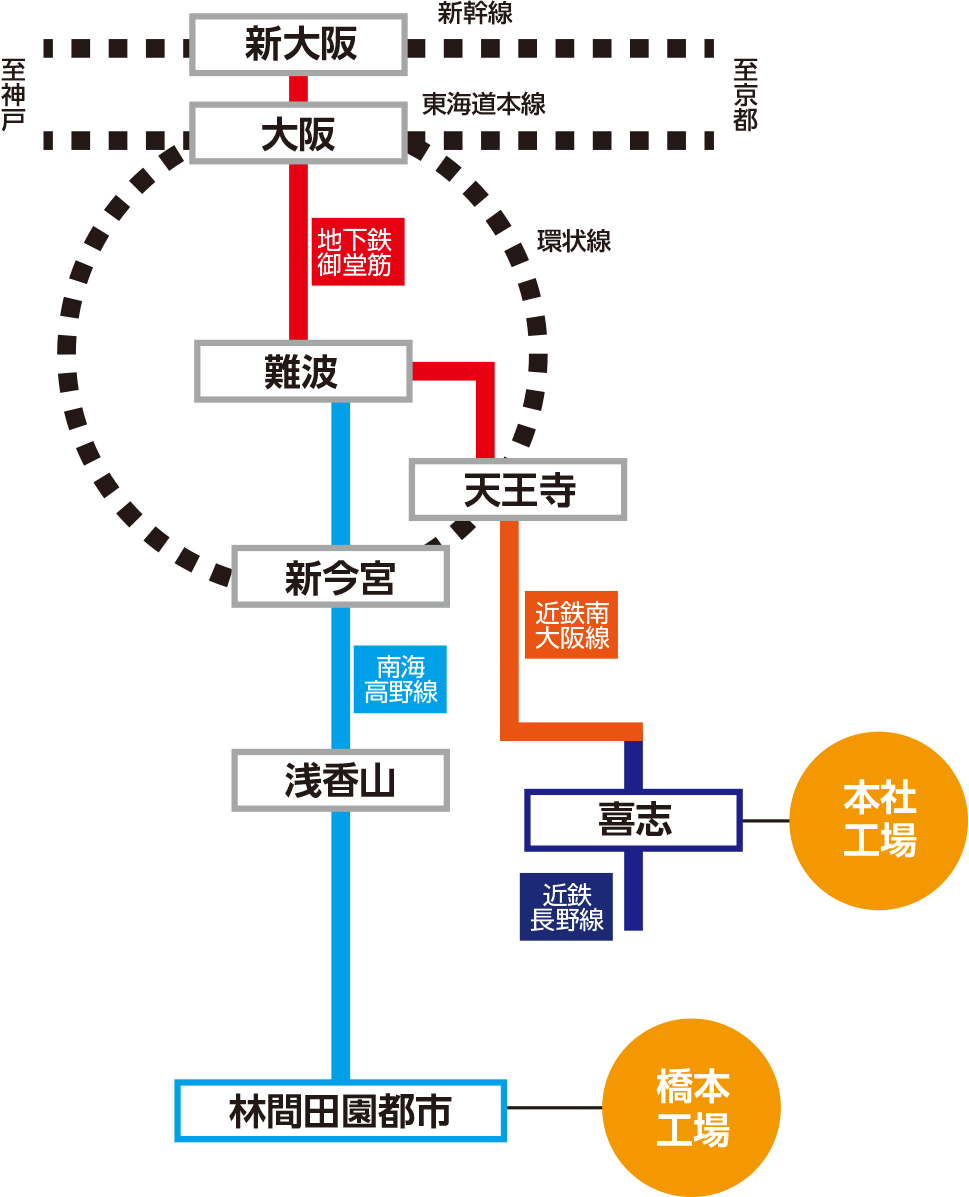 - ※堺事業所(営業部)は、このたび業務効率化の一環として、2024年10月1日付で本社工場内へ移転いたしました。